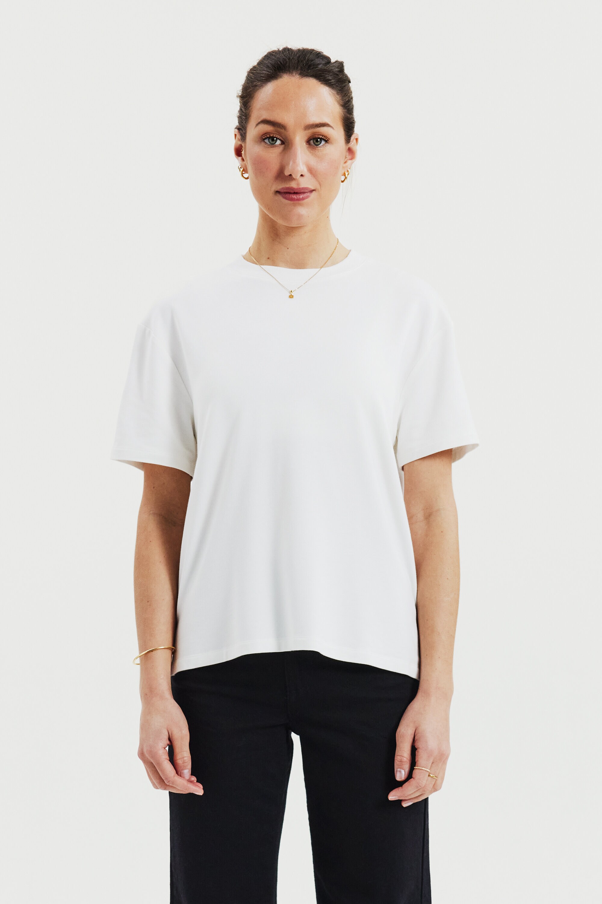 A modern classic with a high neck and boxy design. Made of dense, soft organic cotton which isn't see-through and is perfect for all occasions, whether you want to be sporty, casual or dressed up. Wear it tucked in or out. Concealed seam in the neckline and normal length sleeves.