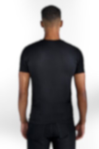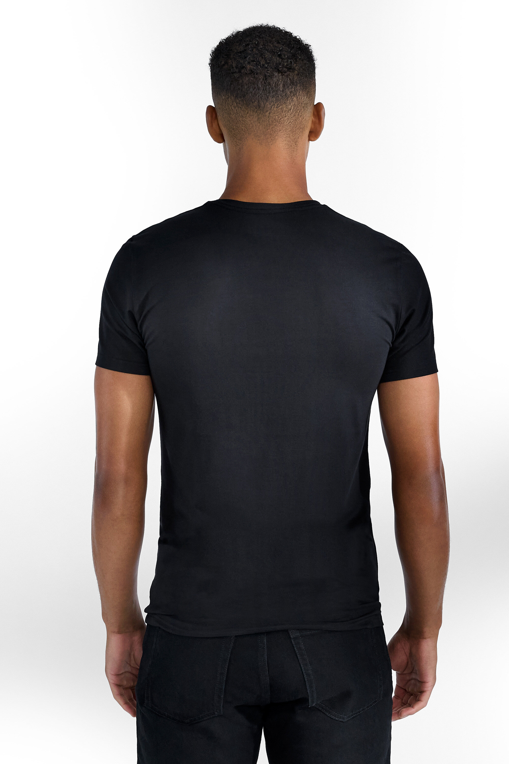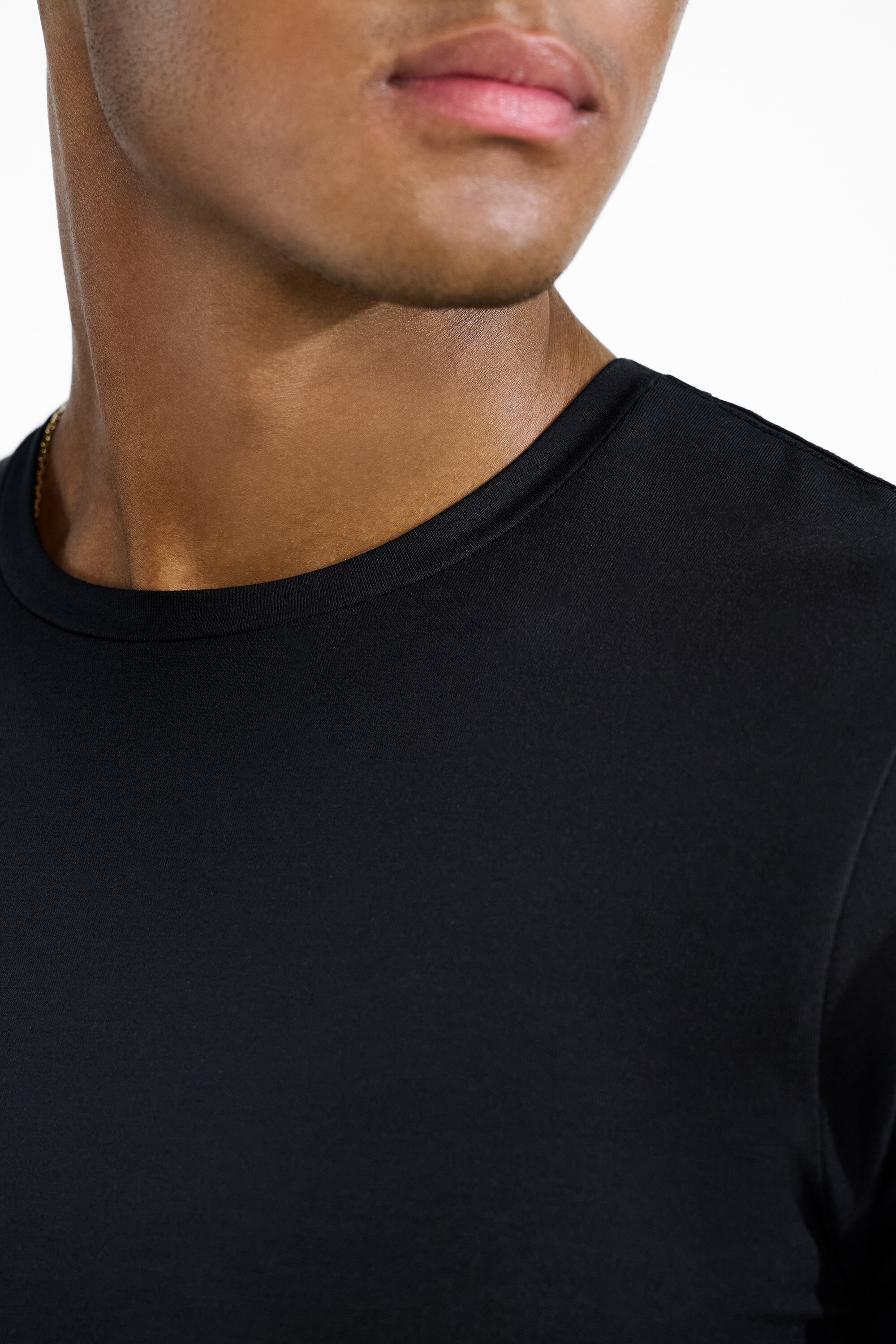 Vervaardigd uit luxueuze Lenzing TENCEL™ Lyocell stof, heeft dit T-shirt een opmerkelijke glans en een zijdezacht gevoel. Het biedt een iets slankere silhouet met precies de juiste hoeveelheid stretch voor een aansluitend gevoel, ideaal voor onder een overhemd te dragen of alleen voor een strakke, lichtgewicht pasvorm. De halslijn heeft een verborgen naad die het comfort verhoogt, terwijl de wasinstructies direct op de stof zijn gedrukt om schuren van labels te elimineren.