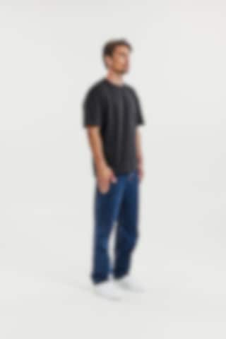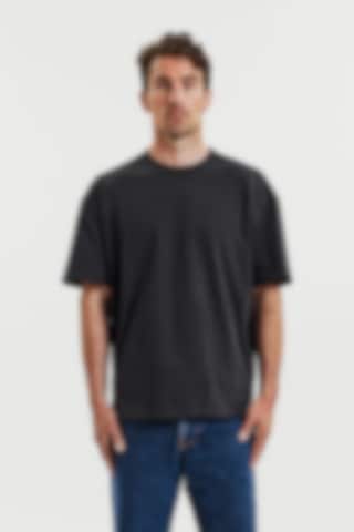 T-shirt gemaakt van stevig 300 gsm biologisch katoenen stof. Het heeft een robuuste halslijn met opvallende stikdetails en stijlvolle zijsplitten. Met iets langere mouwen en bredere schouders krijgt het een subtiele oversized look. Dit kledingstuk komt echt tot zijn recht wanneer het alleen gedragen wordt en geeft een moeiteloos coole esthetiek.
