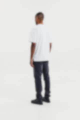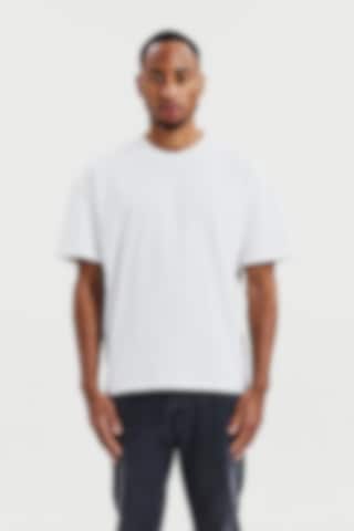 T-shirt gemaakt van stevig 300 gsm biologisch katoenen stof. Het heeft een robuuste halslijn met opvallende stikdetails en stijlvolle zijsplitten. Met iets langere mouwen en bredere schouders krijgt het een subtiele oversized look. Dit kledingstuk komt echt tot zijn recht wanneer het alleen gedragen wordt en geeft een moeiteloos coole esthetiek.