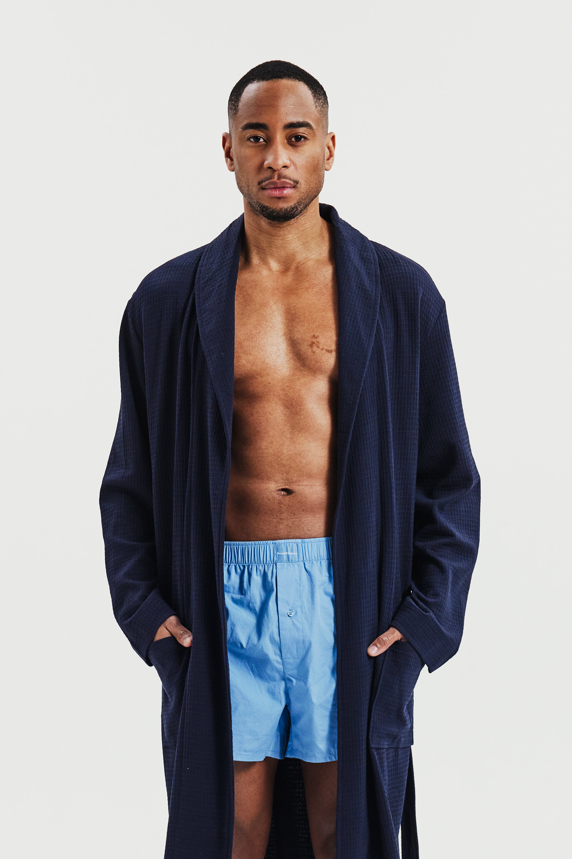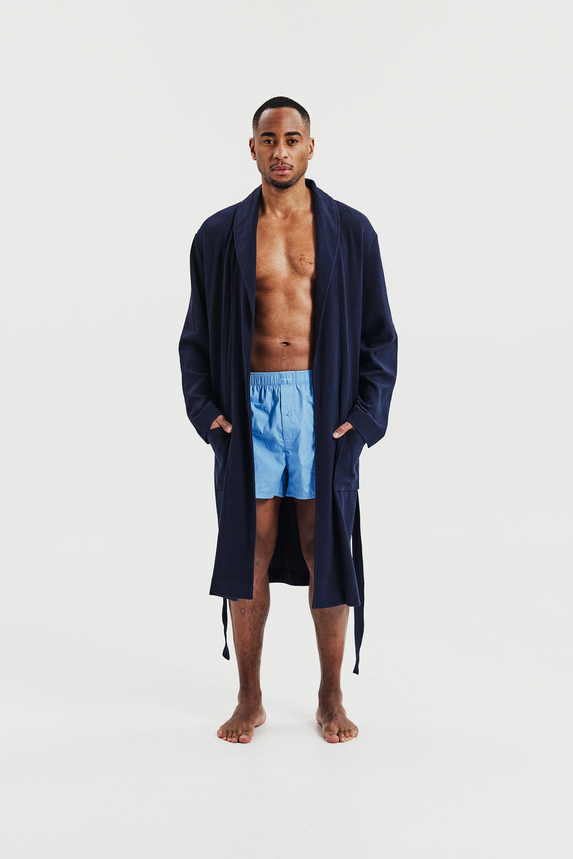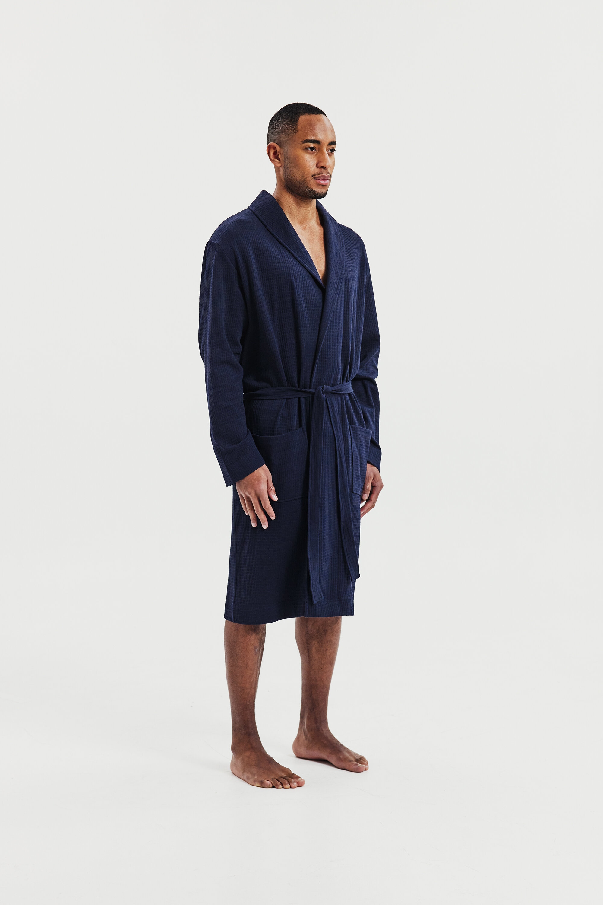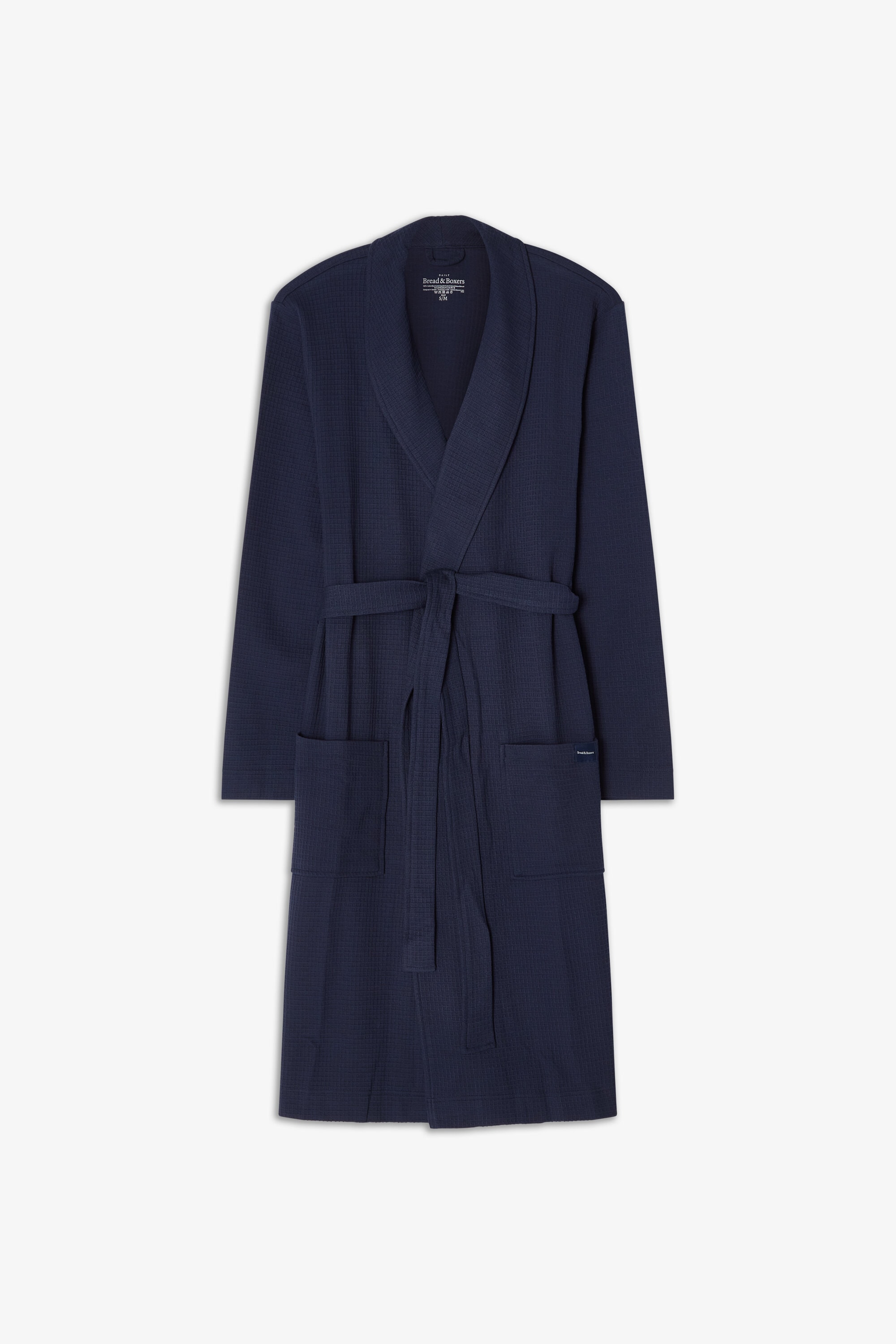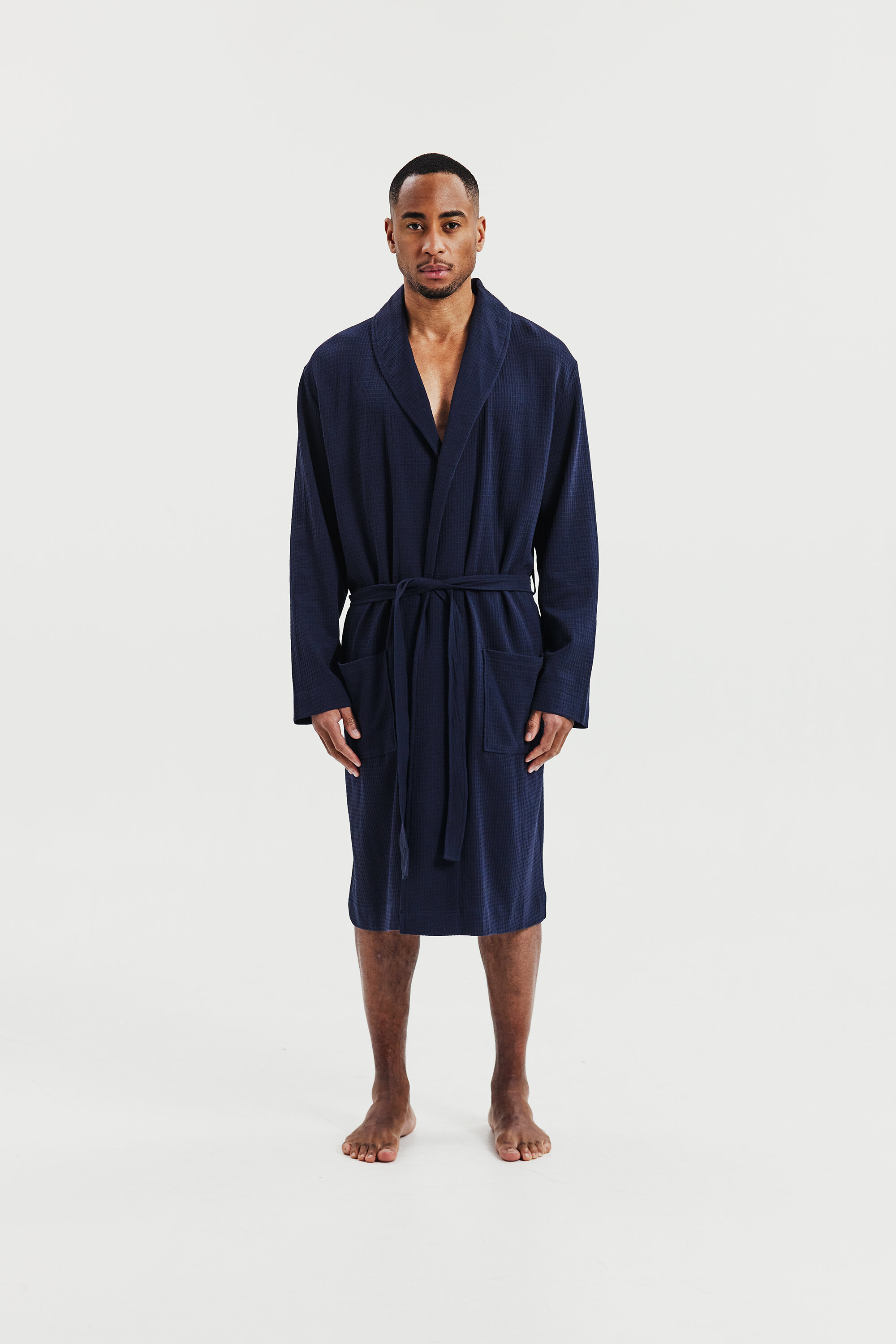 Designed for both comfort and style, this well-fitted cotton waffle-knit robe features a belt and double front pockets. Its versatile design makes it perfect for lounging at home or relaxing by the beach.