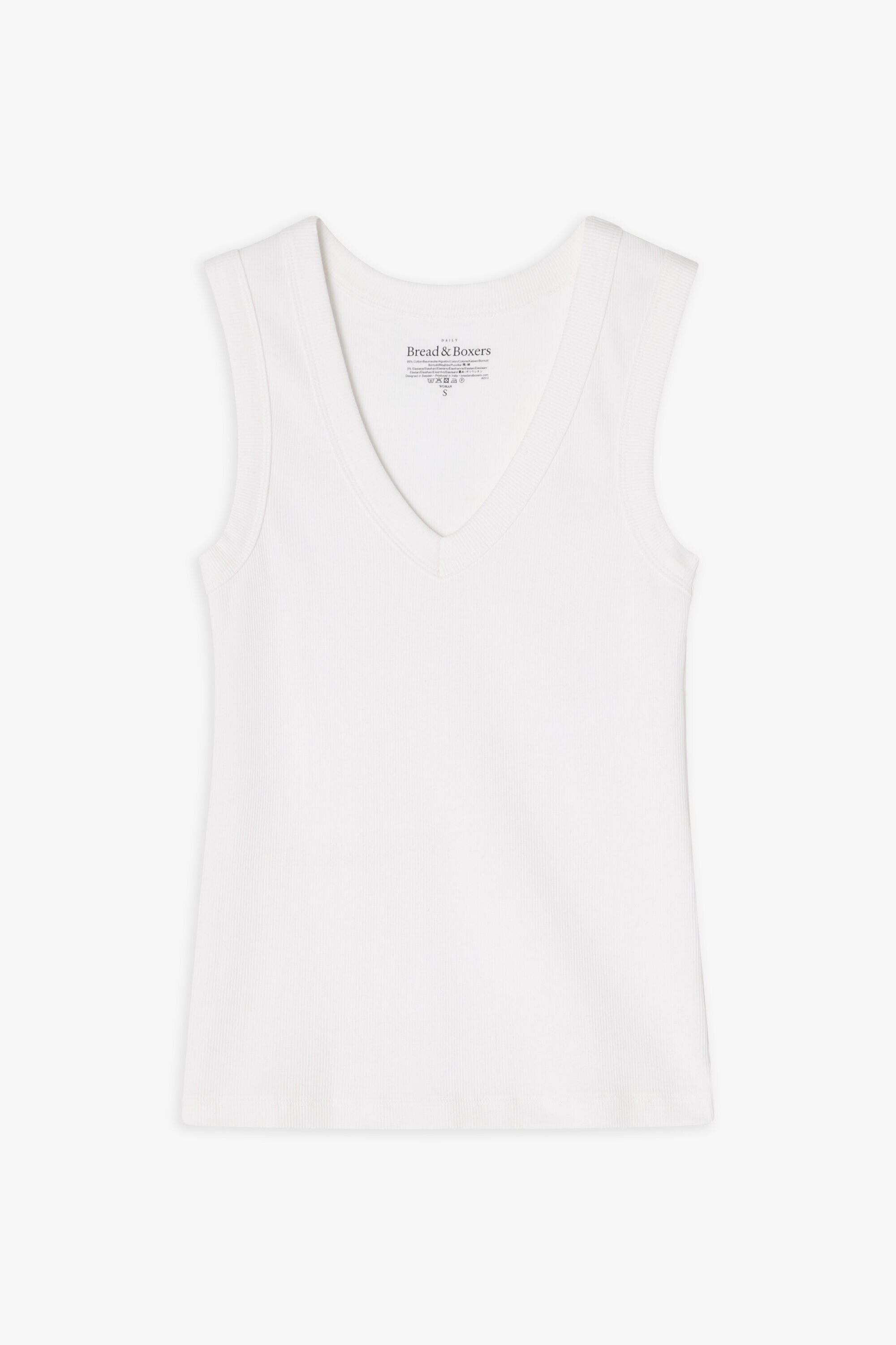 Geribde tanktop / singlet voor dames met diepe V-hals. Gemaakt van een zachte ribstof van 95 % katoen en 5 % elastaan voor een comfortabele en flexibele pasvorm. De diepe V-hals en brede afwerkingen zorgen voor een strakke en gestructureerde look, terwijl het slanke silhouet de top perfect maakt om te dragen in laagjes of op zichzelf tijdens warme dagen. Een eenvoudige en tijdloze tanktop voor dames, onmisbaar in elke basisgarderobe.