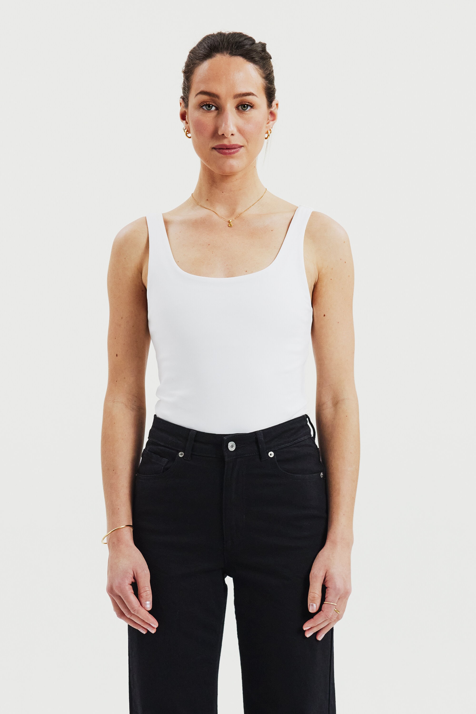 Elegant tank top made from an organic double layered cotton jersey for a luxury feel. Its hidden seams and perfected bands makes it just as suitable for the party as an everyday staple. The unique design is fully covering, has a scooped back and provide a slight shaping feel. We love to style it with almost all items in our wardrobe but especially with a festive skirt or with jeans and a blazer.